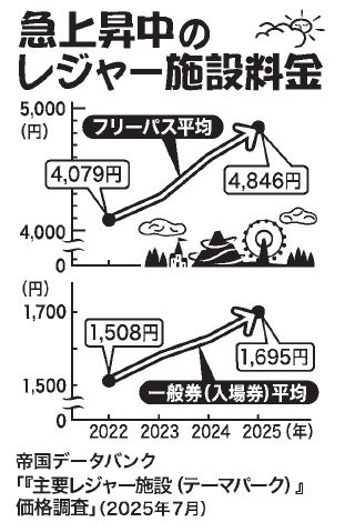 顕著な物価上昇が起き始めた22年と比べると、チケット料金の平均は右肩上がりに急上昇中です。入場料とアトラクション乗り放題がセットの「フリーパス」料金の平均は、22年に4079円だったのが、25年には4846円に。18.8%の上昇です。一般券(入場料)は1508円から1695円と12.4%増です。