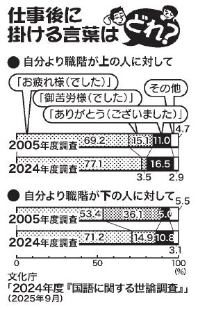 文化庁がこのほど発表した2024年度「国語に関する世論調査」によると、会社で仕事後に同僚にかける言葉として、「御苦労様(でした)」が使われなくなってきていることが分かりました。年齢が若くなるほど、特にその傾向が顕著です。